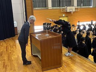 次に生徒会役員任命式を行いました。先生方の呼名に対する返事から、1人1人の強い決意を感じるとともに、本当に頼もしく思いました。前期、学校・学級の中心として、大いに力を発揮してください。任せました。
