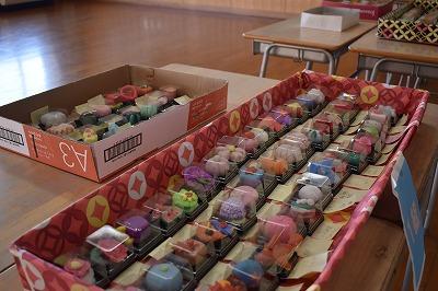 2年生の多目的フロアに、美術科の授業で制作した「津幡銘菓」が展示されています。樹脂粘土を使って、一人一人お気に入りの逸品が完成しました。