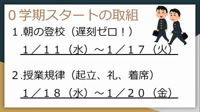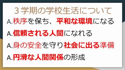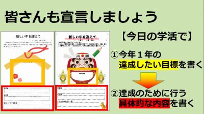 校長からは、「目標がその日その日を支配する」ということについて、生徒指導担当からは「次年度の準備をする」こと等について、学習担当からは「目標達成のためには『意識+環境』が大切」といことについて話をしました。令和5年が始まりました。全校生徒がそれぞれの目標に向けて頑張っていくことを期待しています。