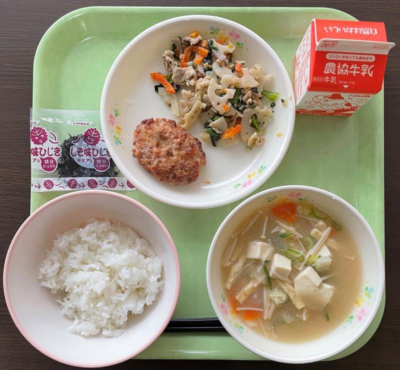 1/10(火)のメニューは「ハンバーグ和風おろしソース」「れんこんと小松菜の塩炒め」「ごはん/しそひじき・みそ汁」「牛乳」です。