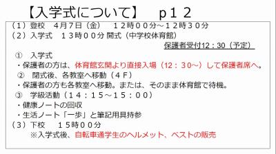 校長が本校が大切にしていることや部活動について説明した後、育友会:宮嶋会長に育友会についてのご説明をいただきました。その後、主幹教諭からは中学校生活全般について、研究主任からは中学校での学習について説明をしました。各担当からは、『スマホ等の情報端末との付き合い方が学力向上及び心身の成長に大きく関わってくる』という内容の話をさせていただきました。是非、ご家庭でお子さまと話し合って『スマホ等の使用ルール』をつくり、適切に使うよう願っています。