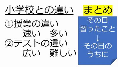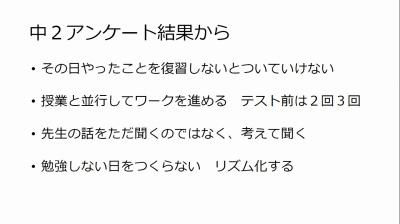 ・家庭学習の習慣を身に付けて、テスト前に急いで勉強するということをなくしていきたい。