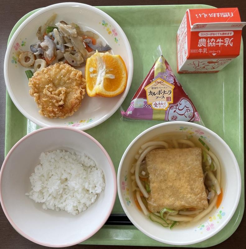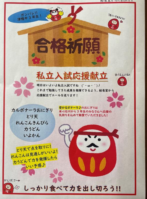 本日の給食は『私立入試応援献立』です。力うどんやいよかん(いい予感)などのメニューです。なお、「受カルボナーラおにぎり」は米心石川さんから3年生に、特別に無償で頂きました。米心石川の皆さま、本当にありがとうございました。