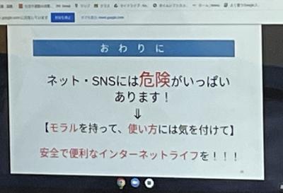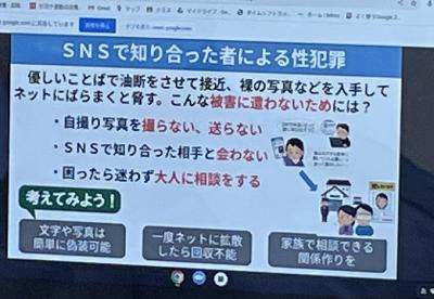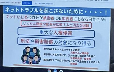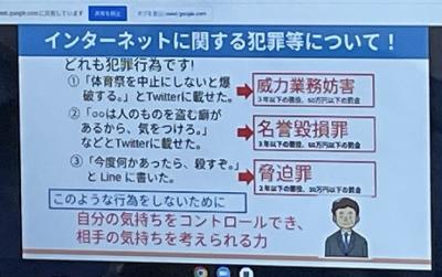 7/20(水)の午後、リモート形式で全校生徒対象に防犯教室を行いました。津幡警察署警部補の山本さんにお話をしていただきました。ネットに潜む犯罪や危険について、被害者にも加害者にもならないための大切なことを説明していただきました。本日のお話を参考に、充実した夏休みを過ごしてほしいと思います。講師の山本さん、ありがとうございました。