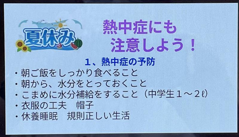 本日の集会(リモート形式)で、養護教諭から感染症の予防とともに、熱中症の予防についても話をしました。