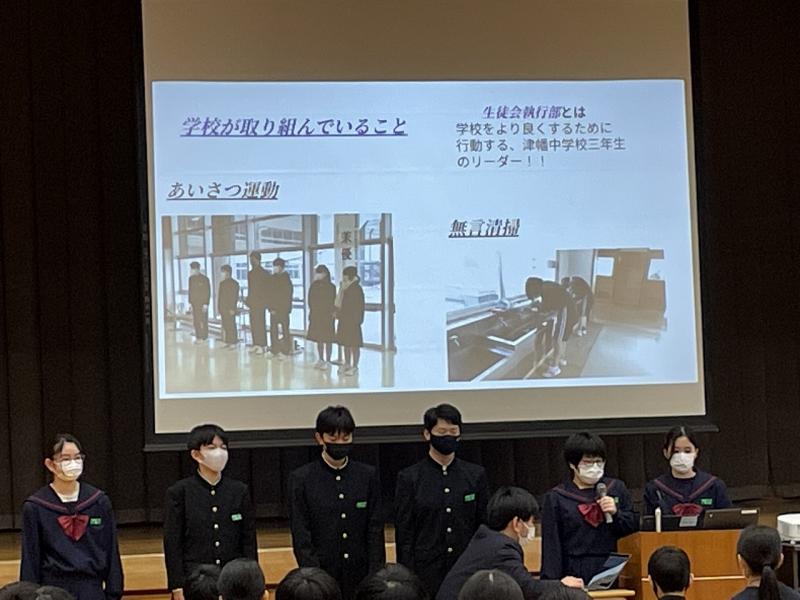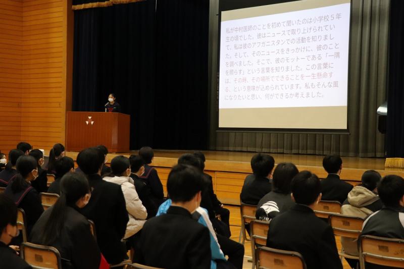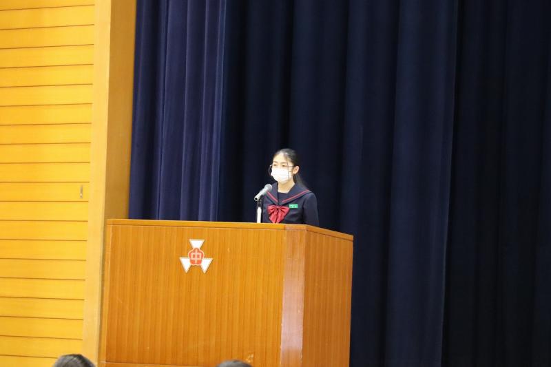 生徒会タイムでは執行部による「挨拶運動」の振り返りを行っていました。また、先日、津幡町英語スピーチコンテストのプレゼンスピーチ部門最優秀賞を獲得した北口さんには、全校生徒の前で英語スピーチを披露してもらいました。英語の発音・表現等はもちろん、内容が本当に素晴らしいスピーチでした。世界の平和と安定について考える視野の広さと具体的な行動に移す実行力に感心させられました。