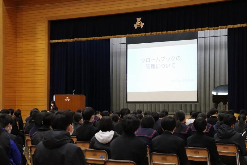 校長講話では「あまり前のことにしっかりと取り組むこと」について、学習からは「プラスの思考・言葉かけを自分自身にすること」について話がありました。その後、クロムブックの使用・管理について全校生徒で確認を行いました。