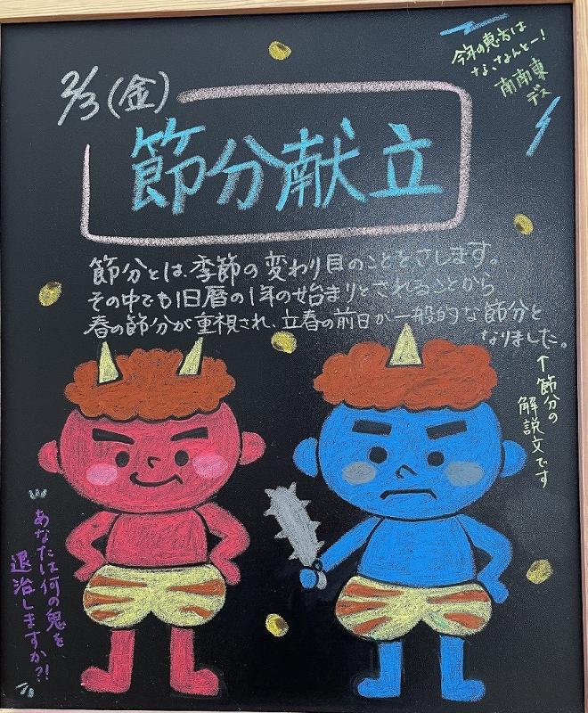 本日2/3(金)の給食は「節分献立」です。しっかり食べて、それぞれの「鬼」を退治しましょう。