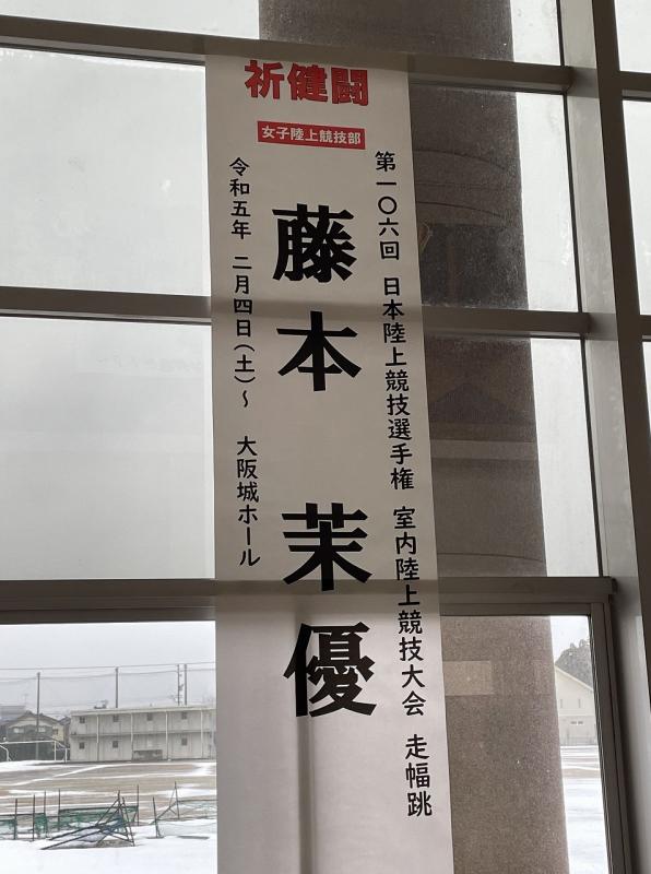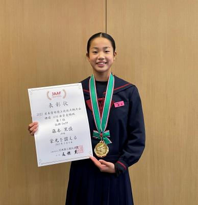 2/4(土)、大阪市:大阪城ホールで行われました「第106回日本陸上競技選手権大会(室内競技)」のU16女子走幅跳で、本校陸上部の1年生:藤本茉優さんが優勝しました。日本のトップ8名のみに参加資格があるハイレベルな大会で自己ベスト記録を更新し、5m59cmで優勝しました。快挙達成です。本当におめでとうございます。
