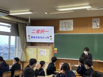 津幡中学校では人間関係づくりプログラムの一環として、朝HR前の短い時間を利用し、「二者択一」という気軽な話し合いを行っています。週のはじめに打ち解けた雰囲気をつくり、互いに認め合い、支え合える人間関係を目指しています。