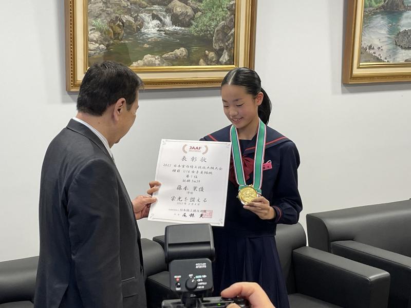 日本陸上競技選手権大会U16女子走幅跳優勝の藤本さんが報告に来てくれました