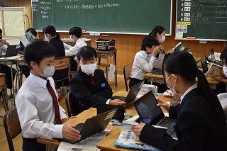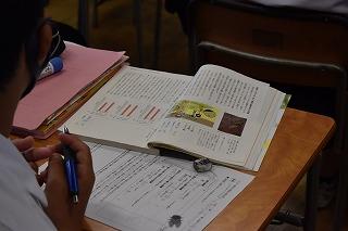 2年生国語科の授業。2年生は現在、「クマゼミ増加の原因を探る」の単元を学習中です。