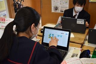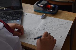 2年生社会科の授業。各自が調べたいテーマについて、クロームブックを用いて情報収集しながら、日本地図にまとめていました。古墳、選挙投票率、ご当地お菓子・スイーツなど、テー設定も1人1人の個性が見られてとても興味深かったです。集中して取り組んでいる姿は、とっても素敵でした。