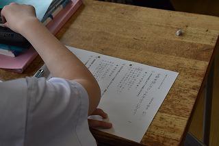 1年生国語科の授業は、言葉のまとまり(文節・単語)についてでした。ワークシートで、「文節に分ける」、「文節からさらに単語に分ける」ことを確認し、教科書の練習問題とワークの問題で、自分自身の定着状況を確認しました。間違えたところの確認は、『その日の内に!』ですね。