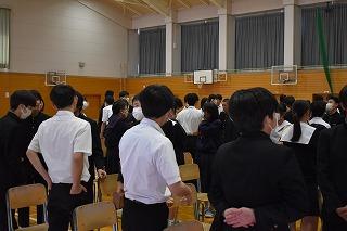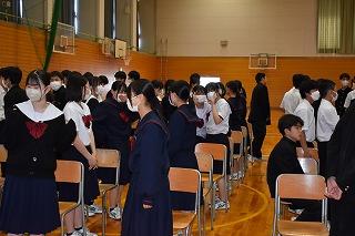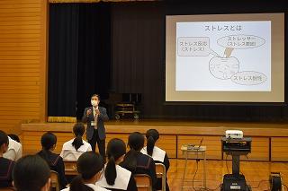 本日4限目に、3年生対象に、「人間関係づくり講座」を実施しました。講師は、カウンセラーの古市先生です。今日のテーマは、『心の健康 ストレスとリラクセーション』でした。クイズを交えながら、ストレスについての理解を深めるとともに、リラクセーション法の筋弛緩法・呼吸法を実際にやってみました。また、2人1組になって、「私は、あなたのOOOに気付いています」を、できるだけ多く互いに伝え合いました。みんなの心が少しやわらかくなりました。ストレスを正しく理解し、自分なりのストレス解消法を見つけていきましょうね。
