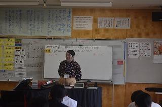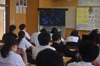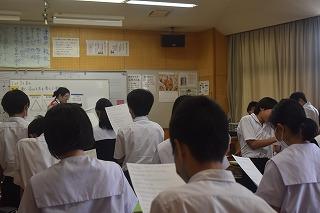 3年生音楽科の授業。階段を上がっていると、4階の音楽室の方から懐かしいサウンドが聴こえてきたので音楽室へ。ポピュラー音楽(一般に広く親しまれている音楽)についての学習でした。ロック、ジャズ、ボサノバなどの特徴について、映像を通してその特徴について考えました。私がお邪魔したときは、ディープパープルの「Smoke on the Water」を視聴中でした。中学時代、ビートルズやカーペンターズなどの曲を聴いて、英語の歌詞を日本語に訳して英語の勉強をしていたことを思い出しました。生徒の皆さんは、ビートルズやカーペンターズって分かるでしょうか? 家の人に聞いてみてください。