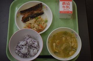 今日のメニューは、ゆかりごはん、飛び魚の竜田揚げ、千切大根のそぼろ炒め、かぼちゃのみそ汁でした。どれも美味しかったですが、油揚げの入ったかぼちゃのみそ汁は絶品でした。調理師、調理員の皆さん、栄養教諭の田路先生、迎教育実習生、今週もおいしい給食ありがとうございました。来週もよろしくお願いします。