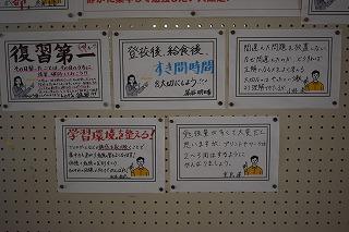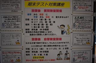 同じく1年生のフロアに、あと「9日」となった1学期期末テストに向けた掲示が置かれています。『良い勉強』と『ダメ勉強』とは、あるいは各先生方からの勉強方法のアドバイスが掲示されています。私もアドバイスを書かせてもらいました。また、放課後の質問教室や自習教室の案内もあわせて掲示されています。1年生の皆さん、しっかりと目を通して、自分の勉強に生かしてくださいね。