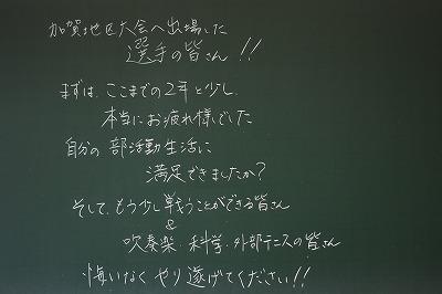 今大会で中学校での部活動はひと区切りとなった3年生の皆さん、今までの部活動、本当にお疲れ様でした。よく頑張りました。試合終了の瞬間、仲間とともに流した悔し涙は一生の思い出です。次は、自分自身の進路選択に向けて歩みを進める時です。地道に一歩づつ自分の目標に近づく努力を続けてください。応援しています。