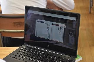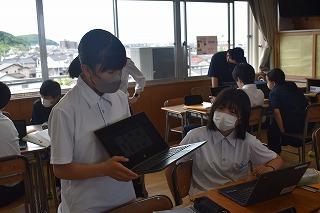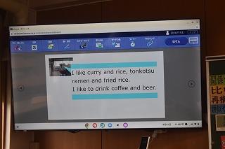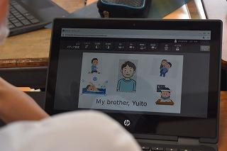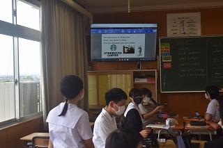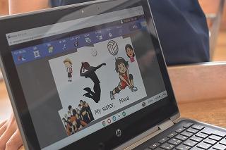 1年生英語科の授業。兄弟あるいは姉妹など各自の身近な人を、グーループの人達に紹介。クロムブックの画面を聴き手に見せながら、その人物の好きなことやできることなどを紹介しました。原稿を用意せず、簡単な語句や今までに習った表現を用いて、また相手意識をしっかりと持って、伝えることができていました。自分のことから身近な人などの他者へ、少しずつ英語で表現できる世界が広がっています。