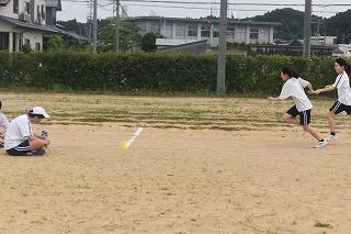 3年生保健体育の授業。あるグループはリレーの練習に取り組んでいました。リレーのバトンパスは、バトンを渡す側、渡される側の走力の考慮や2人の気持ちが合わないと上手く行きません。さすが3年生、互いの息が合っていました。