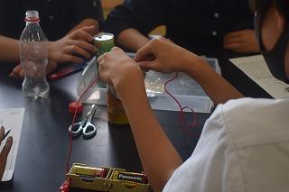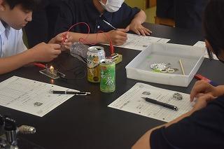まずは、アルミニウム缶やスチール缶、クリップ、割りばし、ペットボトル、ハサミなど12の物体が電気を通すか、磁石を近づけると引き付けあうかを予想し、実験に取り組みました。実験結果から気付いたことを交流し、金属共通の性質(電気伝導性・熱伝導性・金属光沢・展性・延性)について確認しました。次に、シャープペンシルの芯(炭素)が金属か、金属でないかをどう判断すればよいかについて、金属共通の性質を根拠に考えました。