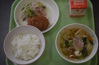 今日のメニューは、ごはん、コロッケ、大根とハムのサラダ、八宝菜でした。いつも通り全部美味しかったですが、特にコロッケと八宝菜は最高でした。調理師、調理員の皆さん、栄養教諭の田路先生、今週もおいしい給食ありがとうございました。来週もよろしくお願いします。