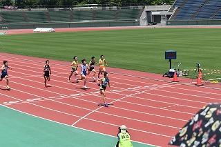 藤本茉優さん(2年)が、女子1、2年走幅跳びでは、大会記録を17㎝上回る5m62㎝、共通女子100mハードルでも自己ベストを0秒37更新する14秒44で制し、両種目で全中標準記録を突破して全国大会への切符をつかみました。素晴らしい跳躍、華麗なハードリングでした。本当におめでとうございます。