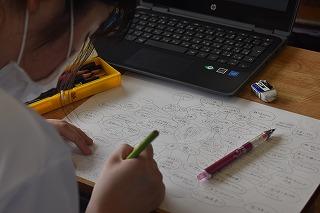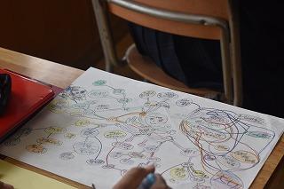 1年生ではキャリア教育の一環として、自分を知り将来の夢や目標について考えるために、マインドマップを活用して、自分自身を深く見つめることに取り組んでいます。頭の中で浮かんだ連想を、そのまま「見える化」してみる。私たちの頭は、最初から整理された考えを作ってくれるわけではなく、最初は混沌としたアイデアをバラバラに生みだします。一見、関係ないように思えるアイデアが生まれたとしても、「これは関係ない」と勝手に判断せずに、とにかく、どんどんマインドマップで「見える化」してみると、関係ないように思えたことが、後から思わぬ素晴らしいアイデアや新たな自分自身の発見につながることが多々ありますね。
