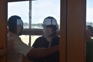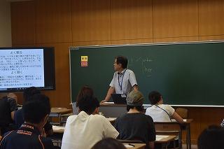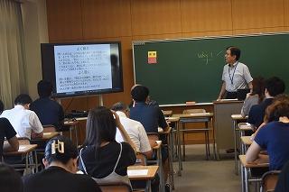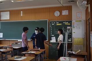 不審者侵入時の初期対応等について講義をいただいた後、不審者役の山本警部補を相手に、実際を想定したシミュレーション(授業中、廊下に不審者がうろついているとの想定)を行いました。2グループ(3人1組)の対応を実際に見ることで、具体的イメージを持つことができました。