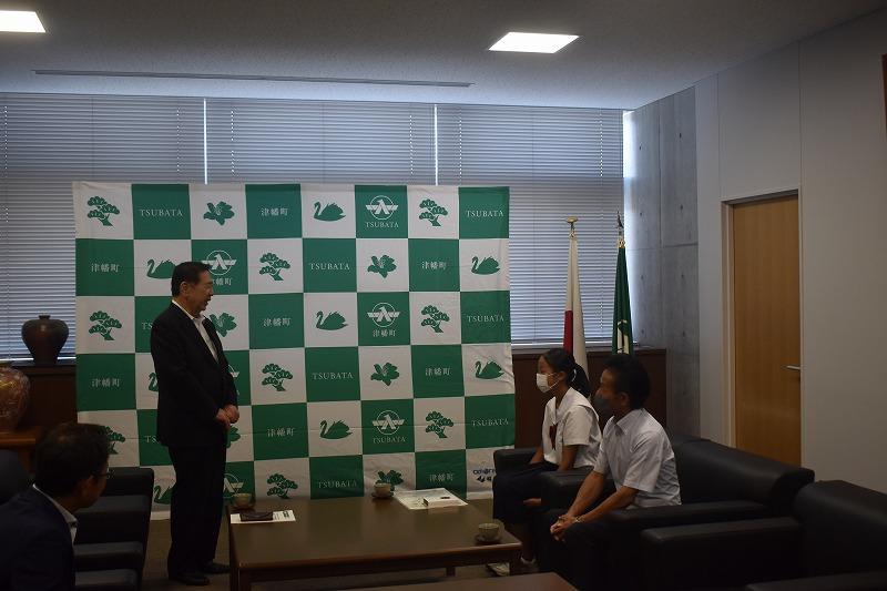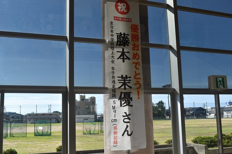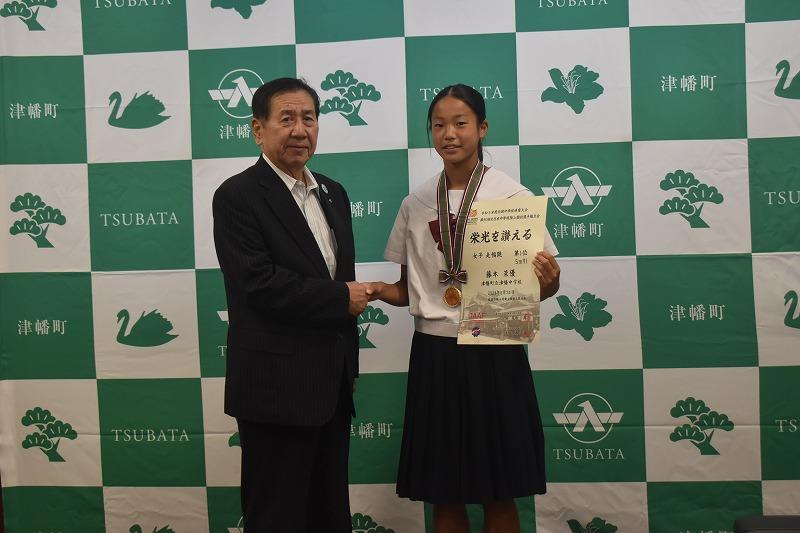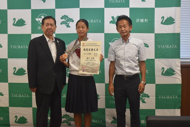 本日午後に、藤本茉優さん(2年)と顧問の山本和彦先生が、津幡町役場を訪問し、全日本中学校陸上競技選手権大会女子走り幅跳びでの全国制覇の報告を、矢田津幡町長に行いました。大会前は、今回は入賞、来年に優勝を目指すという目標設定でしたが、県中学記録、北信越記録を更新しての見事な優勝でした。今後の目標は、あと9センチと迫った6m越え、そして全国中学記録の更新です。藤本さんのこれからの活躍をまた、楽しみにしています。応援しています。