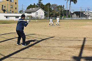 グランドでは野球部が練習。内野守備ノック。顧問の谷口先生の正確なノックが部員たちの守備力をアップさせていきます。懸命にボールを追う姿、仲間を励ます姿は美しい。