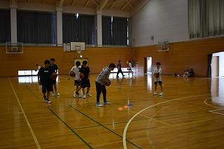 本校体育館では、男女バスケットボール部が練習。男子チームは、顧問の重島先生の指導のもと、基本的な動きの習得に励んでいました。ドライブをしかけて、相手ディフェンスが出てきたら一旦バックし、タイミングをみてまた仕掛ける、相手との間合いを図ったり、相手の状況判断が瞬時にできるようになると、またひとつプレーの幅が広がりますね。