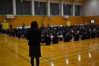 生活担当の奥泉先生からは、①先月までの皆さんの様子②冬服・防寒具の確認③自転車通学の判断について、話がありました。先月は生徒の皆さんの素敵な姿がたくさん紹介されましたね。冬がもう少しでやって来ます。冬の身だしなみについて確認し体調管理に努めるとともに、交通ルールの順守、自分自身の安全には十分配慮してください。