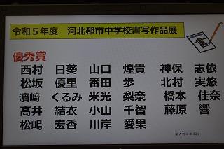 河北郡市中学校美術作品展の「3年生の部」の作品が職員室前の廊下に展示されました。テーマは「身近な人」です。どの作品も各校から選ばれてきただけあって、つい足を止めて見入ってしまうものばかりです。本校の生徒の皆さんの作品はもちろん、河北郡市の他中学校の皆さんの作品も大いに堪能してください。