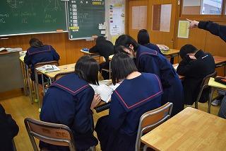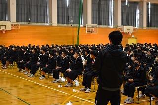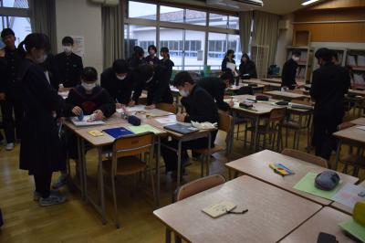 今週は27日(月)28日(火)に、2学期期末テストが行われました。来週5日(火)には、3年生は第3回郡市統一テスト、2年生は町学力実態調査が行われます。特に3年生にとっては、進路選択に向けて気の抜けない日々が続きます。進路選択に向けて悩みや不安があるのは誰しも同じです。今日の全校集会でも伝えましたが、授業を含めた学校生活において、自分も周りも大切に、互いに高め合う集団として、目指す目標に向けて歩みを進めていきましょう。応援しています。