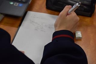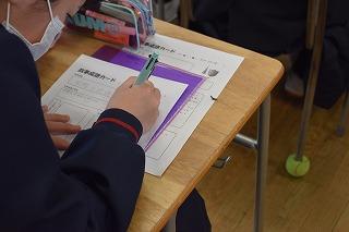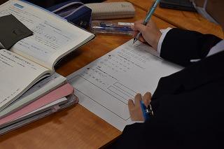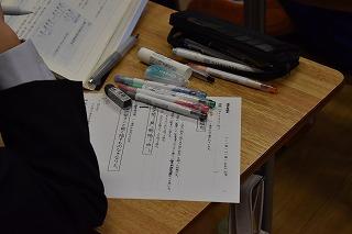 内容は2点ありました。ひとつめは、「講座学習」についてでした。「講座学習」とは、1年生からの学習内容を復習し、定着を図るためのものです。帰りホームで配付されたプリントを、家庭で問題集とともに進め、翌日の朝ホームで確認し理解を深めるというサイクルで進められます。