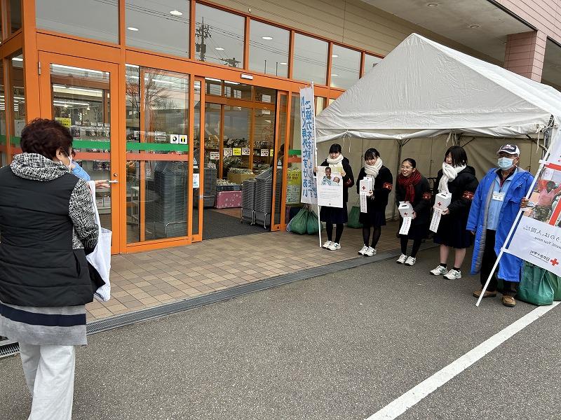 昨日お知らせしたとおり、本日15時30分より、Aコープ津幡店入り口において、津幡町赤十字奉仕団の皆様と本校JRCメンバー(生徒会執行部)とで、街頭募金を行いました。寒い中、本校JRCメンバーは、素敵な笑顔でお店を訪れる方々に募金の協力を呼びかけていました。