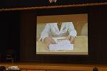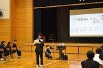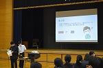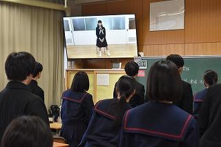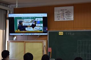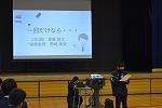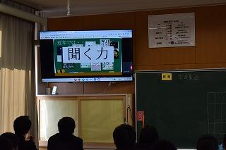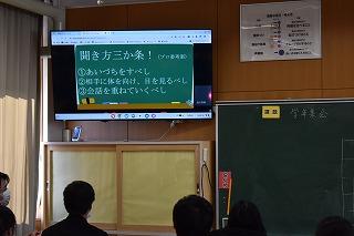 2年生学年集会の内容の2つめは、プログラム委員会からの「聞く力」についての提言でした。「聞く力」がどうして大切なのか、委員自らの実演映像も交えながら、生徒の皆さんに訴えかけてくれました。最後にプログラム委員考案の『聞き方三カ条』が披露され、ひとりひとりが意識して取り組んでいくことを確認しました。
