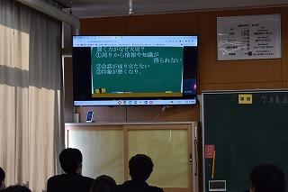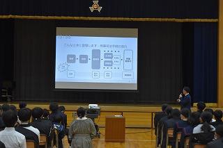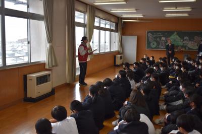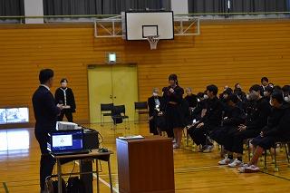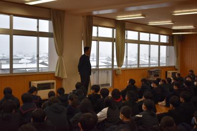 本日5限目に、1、2年生を対象に、河北保護区保護司会の方々、金沢保護観察所観察官の方に来校いただき、講演会を開催しました。保護観察の具体的な仕事の内容と、SNSでの軽はずみな投稿が、刑法に触れ罰せられるいくつかのケースについて話していただきました。