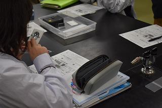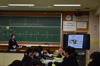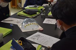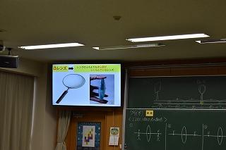 1年生理科の授業。レンズに入射した光の進み方について学習してました。授業を参観した時は、 実際に凸レンズを扱いながら、凸レンズのさまざまな働きについて確認していました。