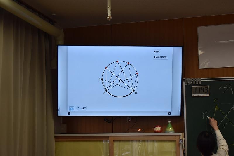上の写真のように、円周上の任意の地点に点Pを取り、∠APBの角度を測りました。どの位置に点P(弧ABを除く)を動かしても,∠APBの大きさは等しくなりました。「あっ、50°で同じだ」という声があちらこちらから。ということは、「1つの弧ABに対する円周角の大きさは一定」ということなのですね。円周角の定理は、円で角度を求める問題では、必ずと言っていいほど活用する定理だと思います。インプットした知識を、問題を解くことでアウトプットしてくださいね。