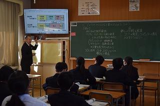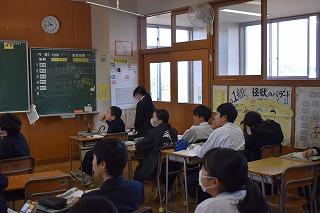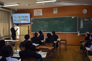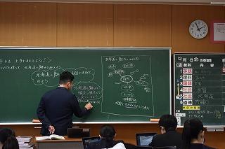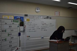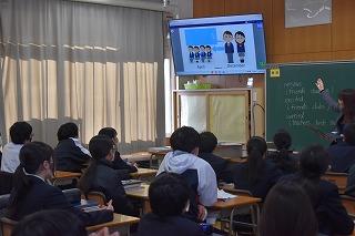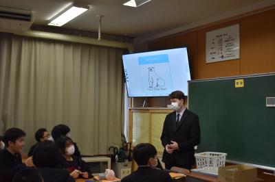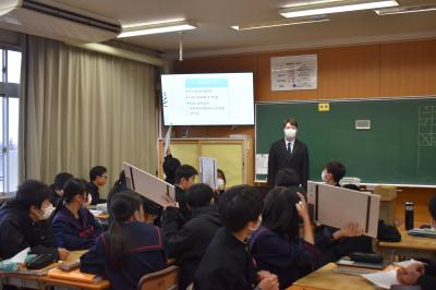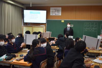 本日6限目に、英語科田中先生の研究授業が1年4組で行われました。今日の研究授業は、県教員総合研修センターの希望研修「優秀・マスター教員に学ぶ」として行われたもので、授業参観と交流会を通して、自身の授業力向上を目指すことが目的です。本日は11名の受講者が来校しました。