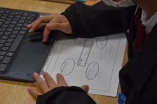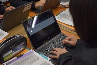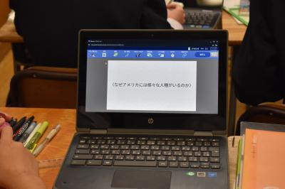 1年生社会科の授業。アメリカについての学習のまとめとして、「なぜアメリカには様々な人種がいるのか」について、レポート作成に取り組んでいました。現在においても、経済やテクノロジーなど世界に大きな影響力を持つアメリカ。そこになぜ大勢の人種が集まってくるのか?学習したことを振り返りながら、国土、文化、自由・平等の理念など様々な観点から考察しながら、クロムブックにまとめていきます。