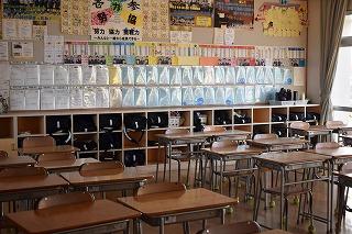 1年生の空き教室の様子。教室前を通り過ぎるだけで、クラスの皆さんの「気持ちのいい学びの環境づくり」への配慮が伝わってきます。