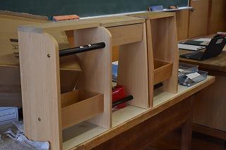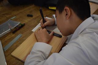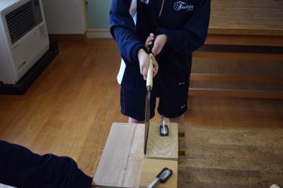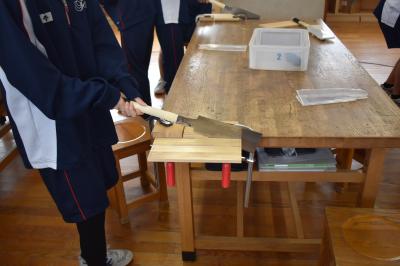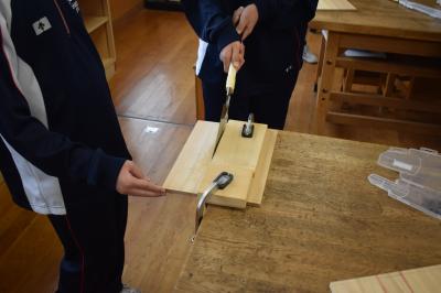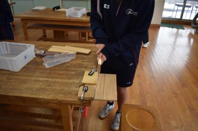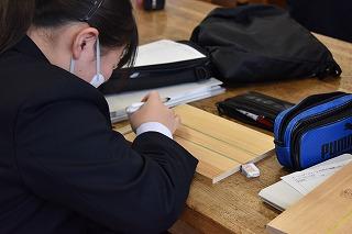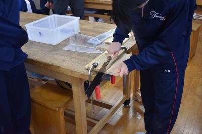1年生技術家庭科技術分野の授業。現在、イスの製作中です。今日は箱側板の切断でした。まずは村井先生のお手本の実演を観察。先生がリズムよくのこぎりを動かし、「ぎこぎこ」の音を刻むと、「おー」と感心した声が。次は生徒の皆さんの番。側板をセットして、のこぎりを動かします。最初はぎこちない様子でしたが、しばらくすると、あちらこちらから「ぎこぎこ」の心地よくリズムを刻む音が聞こえてきました。