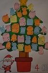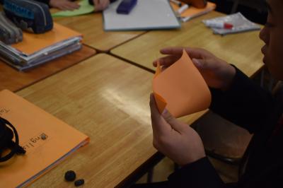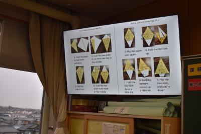 An English class of the seventh grader, They challenged origami. Looking at the photographs and explanation of the monitor, they made a  christmas tree with origami.