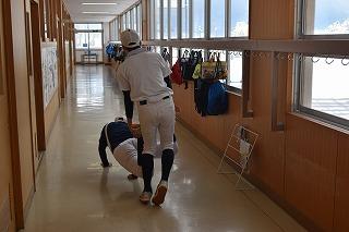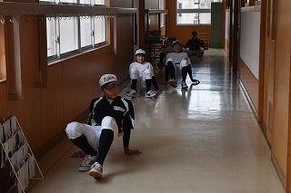 学校では、野球部、男女陸上部、男子バレーボール部、吹奏楽部が練習。野球部は、各階の多目的フロアを使って、ティーバッティングや体力トレーニングに励んでいました。