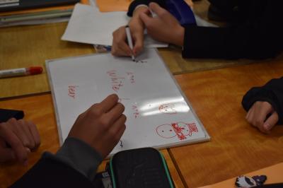 2年生英語科の授業。いつもは少人数授業を実施していますが、今日は合同でアンジェロ先生からのクイズにチャレンジしていました。モニターに現れた英語のヒントを参考に、グループで答えを考えました。クイズの答えの一つは、ホッキョクグマでした。各グループの答えを覗いてみると、"White bear"や”Ice bear" などの解答。ホッキョクグマは、「極地の」という意味の "polar" を使って、"Polar Bear" と表現しますね。