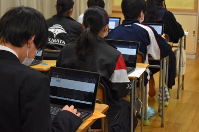 この単元のゴールは、『手紙「拝啓、4月の自分へ」』です。今日はその1時間目。導入で、モニターに写された入学当初の頃の何枚かの写真から、その当時の気持ちを振り返り、「入学した頃の自分に、どんな言葉をかけたいか」という課題を考えていきました。まずは個人思考、その後グループ、全体で伝えたい表現を共有しました。続いて、3年生が1年時の自分に宛てたモデル文が配付されました。大まかな内容を共通理解し、自分が取り入れたい表現をピックアップ、最後に、クロムブックに英文を入力しました。単元での学びを通して、今日の授業での自分に向けたメッセージと単元の最後に書く自分に向けたメッセージのビフォー・アフターを楽しみにしています。1年4組の皆さん、いつも通りの素敵な学びの姿でした。ありがとう。